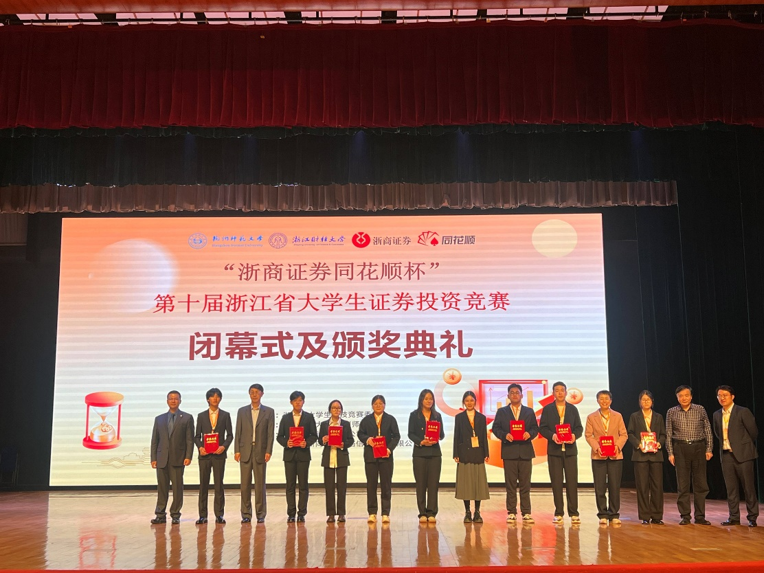 近日,第十届“浙商证券同花顺杯”浙江省大学生证券投资竞赛顺利结束。我校学生在本次竞赛团队赛中喜获佳绩,共获得奖项10项,其中:一等奖3项、二等奖5项、三等奖2项。本竞赛是浙江省大学生科技竞赛委员会主办的省一类学科竞赛,由浙江省大学生证券投资竞赛委员会、浙江财经大学、杭州师范大学、浙商证券、浙江核新同花顺等高校和机构承办。全省40多所高校本科组共892支团队报名参赛,经过初赛、复赛、决赛环节,共评出383支获奖团队。本次竞赛6月上旬开始校级初赛遴选参加省赛团队。入选团队完成投资策略研究报告、平台模拟投资操作和提交投资操作分析报告、现场答辩等环节。11月15-16日在杭州师范大学举行最后现场答辩决赛。